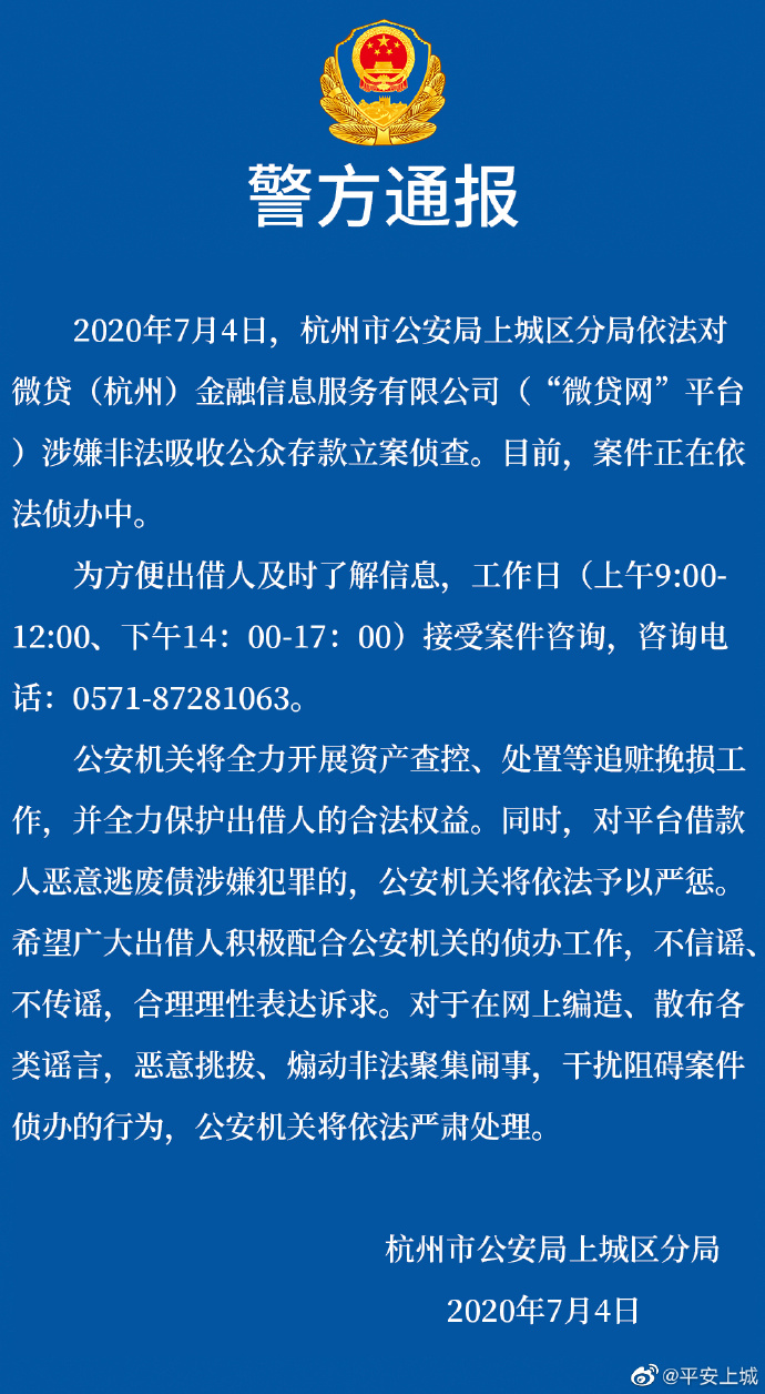 ,微贷(杭州)金融信息服务有限公司(“微贷网”网贷渠道)因涉嫌不合法吸收大众存款被杭州市公安局上城区分局立案侦查。现在,案子正在依法侦查中。【 “微贷网”网贷渠道告贷催收公告】