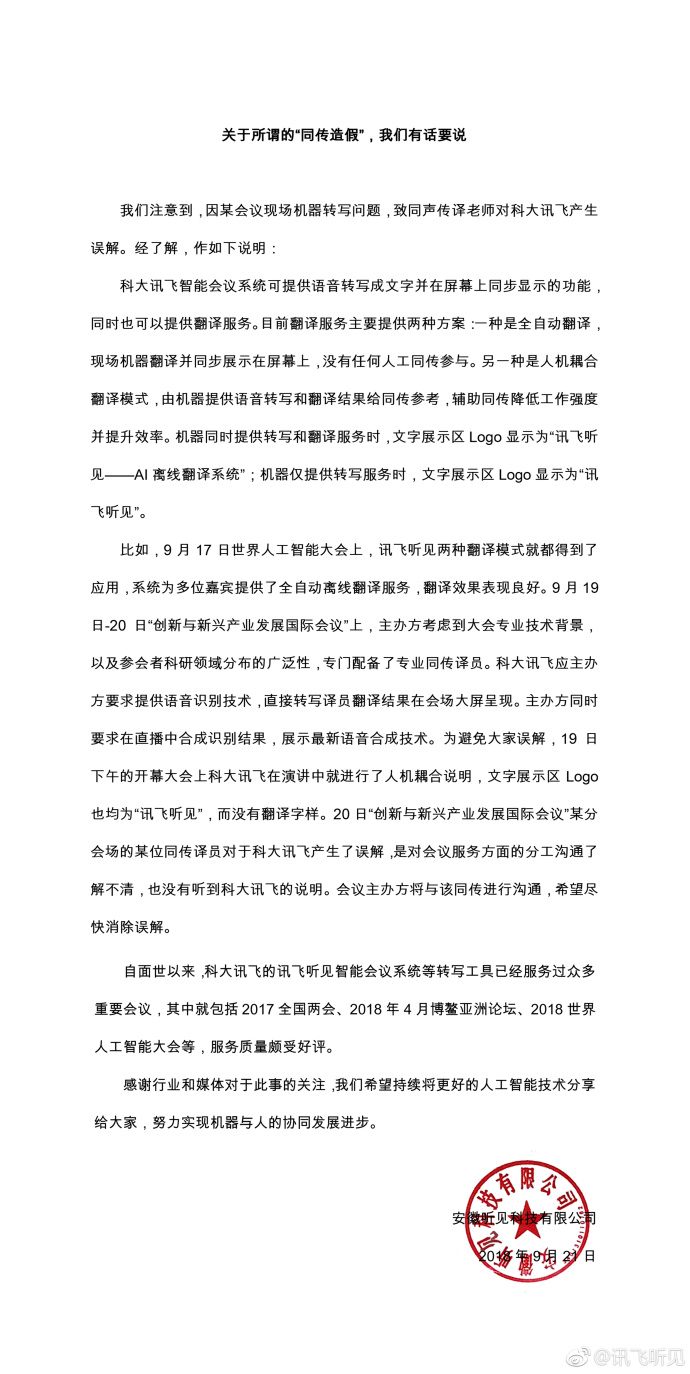 中提到了该同传舌人爆料的 2018 立异与新兴工业开展国际会议,科大讯飞称主办方考虑到大会专业技能布景,以及参会者来自不同国家、不同口音等状况,专门配备了专业同传舌人。科大讯飞应主办方要求仅需供给语音辨认技能,直接转写舌人翻译成果并在会场大屏出现,一起应主办方邀约,在直播中组成辨认成果,展现科大讯飞语音组成技能。科大讯飞表明以为“单个同传舌人关于科大讯飞的误解”,仅仅是对会议服务方面的分工交流了解不清,现在科大讯飞现已托付会议主办方进行交流,期望赶快消除误解。
