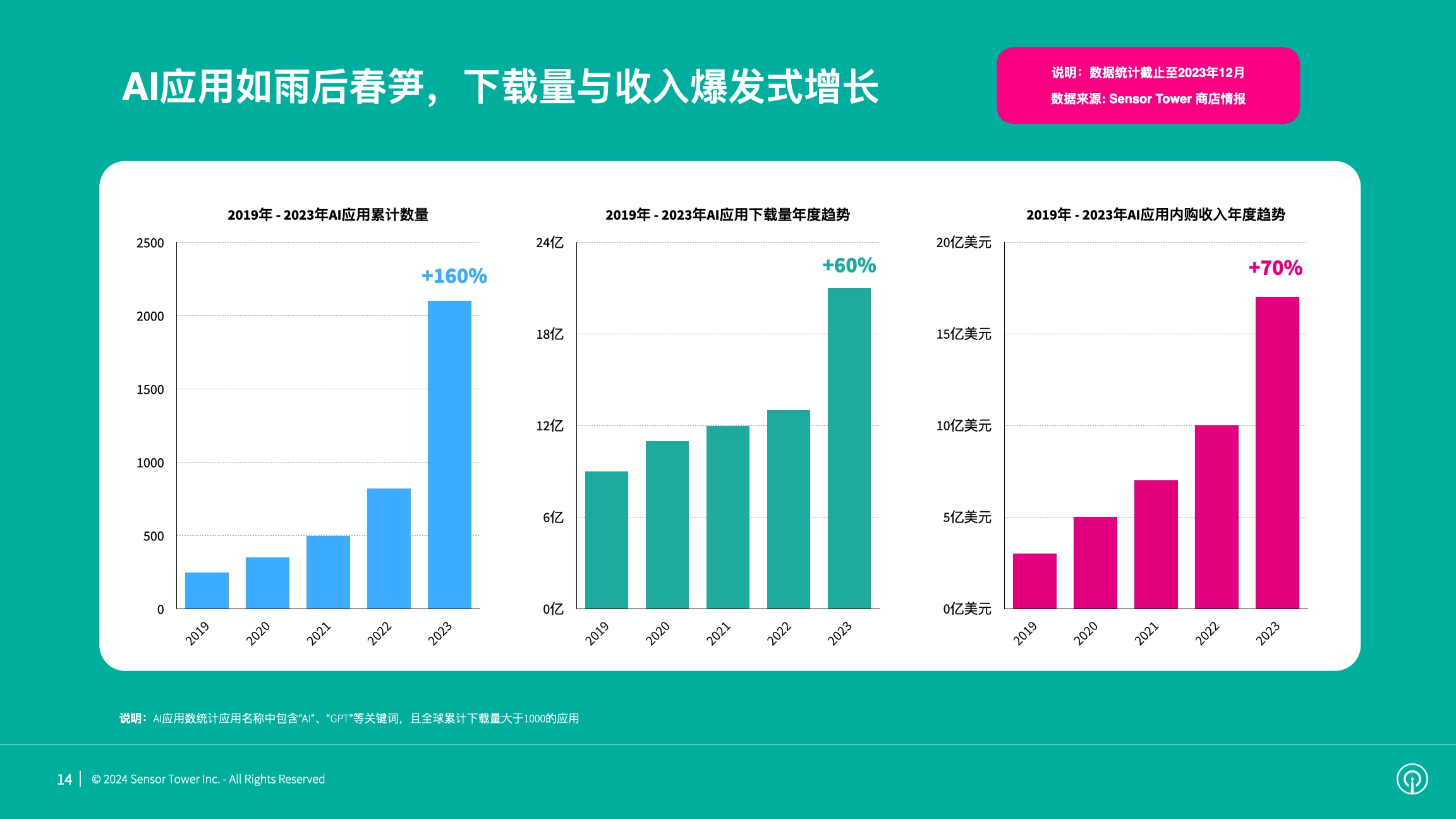 2023年,AI使用迎来爆发式增加,活泼AI使用数量激增160%,逾越2000款。与此一起,AI使用年度下载量和内购收入别离上涨60%和70%,逾越21亿次和17亿美元。